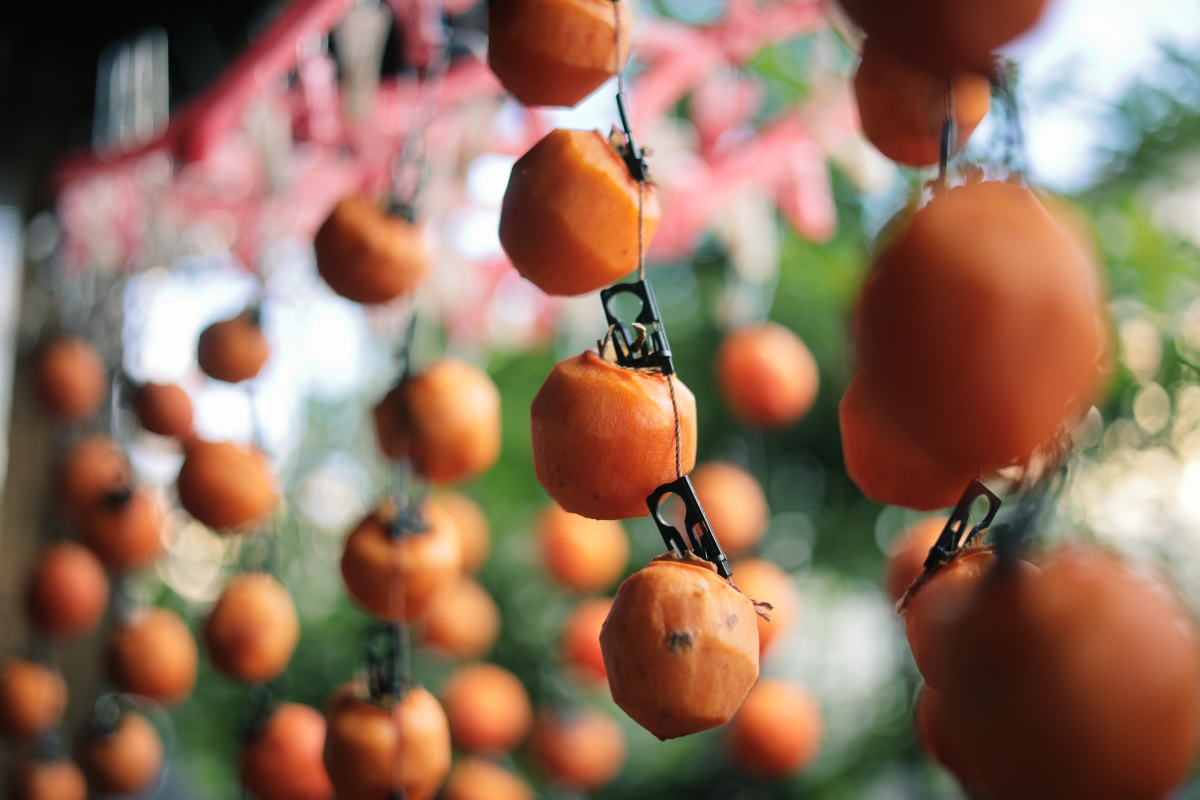 正月用の干し柿の、洗濯物乾しにぶら下げられる季節です。